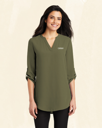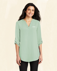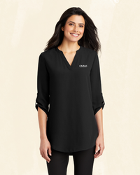 Transition seamlessly from professional life to play in this comfortable and flattering tunic blouse. 4.1-ounce, 100% polyester crepe, Split V-neck, Metal buttons, Roll sleeves with button tabs, Longer tunic length, Gathered back detail.