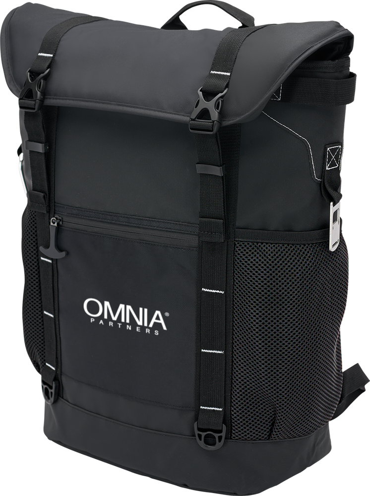 Top-loading 35 can backpack cooler featuring thick foam insulation Constructed out of 55C PVC Mesh Tarpaulin, 38C PVC lining, 10mm foam with 840D pocket Leak-resistant heat-sealed liner Features a main zippered compartment with adjustable double buckle closure, a front zippered pocket with easy grip zipper pull, bold color stitch trim, mesh side pockets, a padded back, adjustable padded shoulder straps and sternum strap, front side daisy chains, reflective trim, side carry handles, and a webbed top handle Includes Stainless Steel bottle opener and carabiner 1-year limited warranty