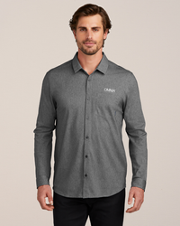 Extend your casual wardrobe with this OGIO knit shirt that has mechanical stretch. The heathered fabric has a subtle pinstripe effect that's evident in the inside collar, locker loop and at the side seam gussets. 4-ounce, 65/35 poly/cotton knit OGIO heat transfer label for tag-free comfort Open collar Sandwiched tonal buttons Left chest pocket with woven OGIO tab Back locker loop Cuffed sleeves Slightly curved hem Shirttail hem can be worn untucked.