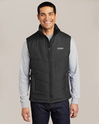 Keep the warmth centered on your core in our Puffy Vests. These wind-resistant, water-repellent styles are great for layering over a long sleeve shirt or under a jacket. Some feature a colorful lining. 100% polyester shell with water-resistant finish, 100% polyester lining, 6-ounce polyfill Zip-through cadet collar Hidden zippered chest pocket Reverse coil zipper Interior storm flap Interior zippered pocket Interior pocket with drawcord and toggle Front zippered pockets Port Pocket for decoration access Open hem with drawcord and toggles for adjustability.